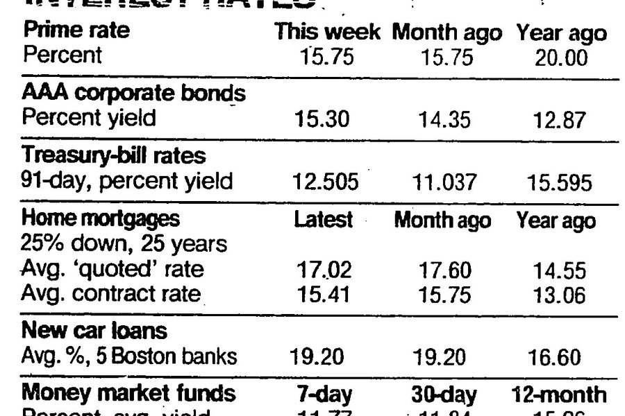 Prime rate This week Month ago Year ago Percent 15.75 15.75 20.00 AAA corporate bonds Percent yield 15.30 14.35 12.87 Treasury-bill rates 91-day, percent yield 12.505 11.037 15.595 Home mortgages Latest Month ago Year ago 25% down, 25 years Avg. 'quoted' rate 17.02 17.60 14.55 New car loans Avg. %, 5 Boston banks 19.20 19.20 16.60 Money market funds 7-day 30-day 12month percent, avg. yield 11.77 11.84 15.96