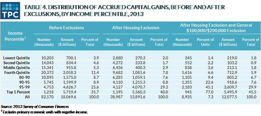 If we classify households by counting gains allocated on an accrual basis, the President’s proposal would affect some households with moderate income. Data from the Federal Reserve Board’s Survey of Consumer Finances show that a small fraction of people with modest incomes have accrued unrealized capital gains large enough to be affected by the tax. (See Table 4 from our report on the distributional effects of the new proposals.)