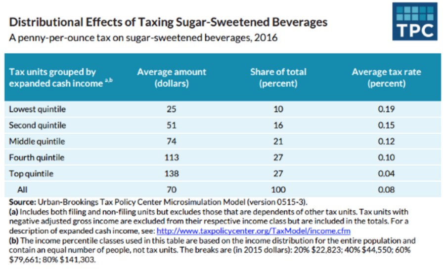 Urban researchers recently published a paper examining the effects of soda taxes. Sanders is right: a soda tax would fall most heavily on the poor relative to their income. A one-cent per ounce tax would produce an average tax of 0.19 percent of income for the lowest quintile of earners, while the same tax would produce an average tax rate of 0.04 percent for the highest quintile.