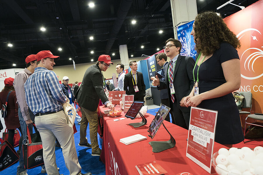 But the actual political messaging by Young Conservatives for Carbon Dividends (YCCD) borders on subversive. At its booth, sandwiched between the Federalist Society and a pro-Electoral College group, smartly dressed students make the case for Republicans to accept mainstream climate science and support a carbon tax as a capitalist solution.