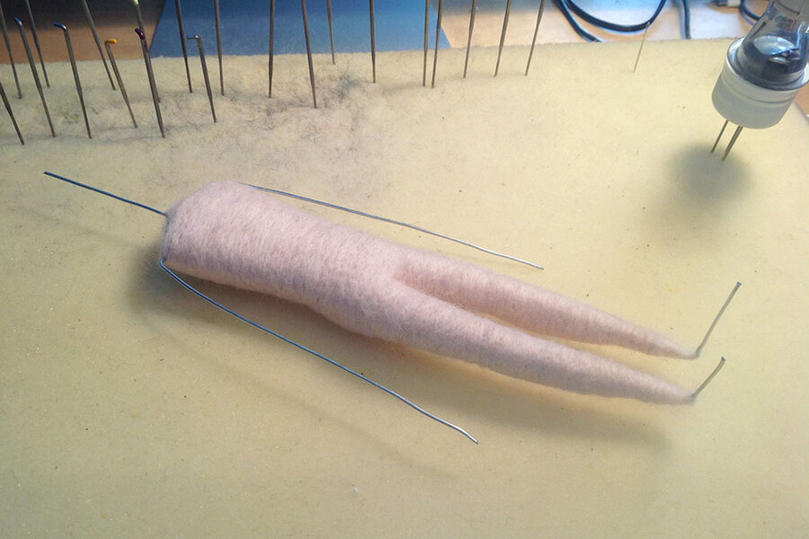 Needle felting is basically sculpting with wool, and the process is labor-intensive. It requires stabbing loose wool (called “roving”) hundreds, even thousands of times with a barbed needle, which entangles the fibres and makes the wool firm enough to hold shape. Our felt figures are built around a wire armature that makes the figures easy to pose and re-pose.