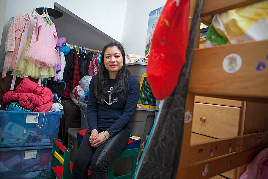 The place is cramped. The narrow hallway that connects the living room to the bedrooms doubles as the kitchen. None of the rooms have closets, so the family members stow their clothes in stacked plastic bins. The lack of storage space also means the rest of their belongings – winter coats, a half-filled box of Pringles cans, a child’s bicycle – clutter the apartment. Though the family qualifies for public housing, Huang says the endless waiting lists and bureaucratic hassles have prevented them from living in a subsidized apartment.