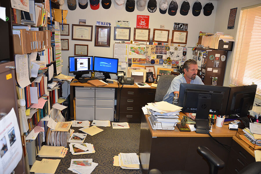 The shelves in his office are jammed with numbered file folders. Some are arrayed in an arc on the floor around his desk. Most are arranged sequentially in shelves along the office walls.