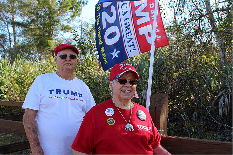 The same goes for Republican voters, even though their primary is largely symbolic. Retirees Jane and Charlie Holstein, who are standing under a red tent with a “Brevard County Republicans” banner across the parking lot from Mr. Withrow’s car, say President Donald Trump has already shown his ability to act decisively to address the pandemic. Mr. Trump is an “experienced manager,” says Ms. Holstein, wearing a “Trump 2020” hat and matching elephant jewelry – and that extends into crisis management. A man leaving the Palm Bay Community Center yells out, “I agree with ya!” to the Holsteins, who wave in return.
