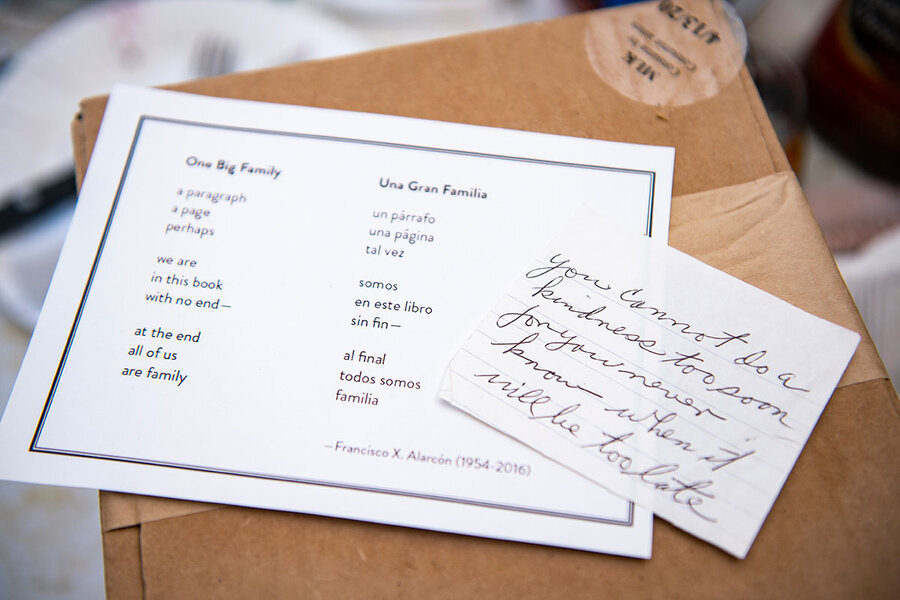 “The reason that it resonates with people is, first of all, it’s a very simple idea, but one that’s very powerful,” says Matt Brogan, executive director of the Poetry Society of America in New York. “I think people recognize that elderly or otherwise homebound people not only face issues around food, insecurity, and social isolation, but also a kind of cultural and intellectual and emotional isolation.”
